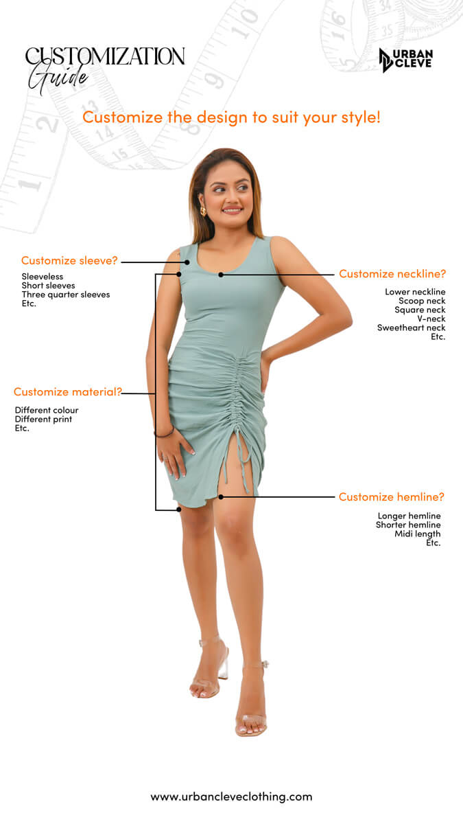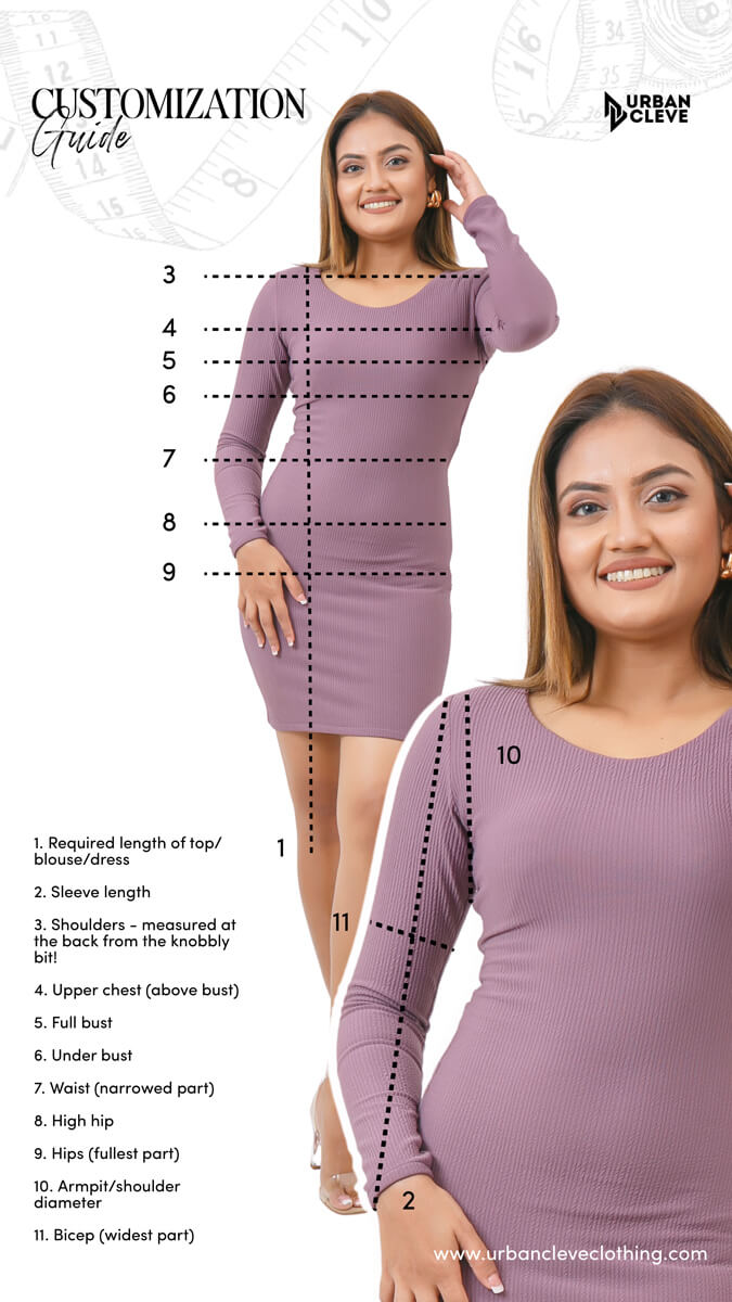 It’s easy to get the perfect fit and customize any item that catches your eye at Urban Cleve. From hemlines to necklines to sleeves, get your favourite outfits customized the way you like. Our size and fit guide will help you to get the right measurements for a great fit with your made-to-order item that makes you look and feel your best.